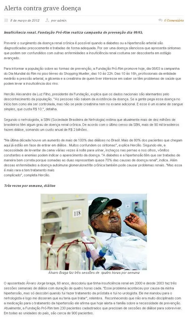 O sonho de fazer um tratamento diferenciado para os pacientes que apresentam doenças renais crônicas, bem como a constatação das dificuldades existentes na saúde pública, levou os dois médicos nefrologistas, Dr. José Aluísio Vieira e Dr. Hercilio Alexandre da Luz Filho, a mobilizarem a comunidade, culminando com a criação da Fundação Pró-Rim em 22 de dezembro de 1987.