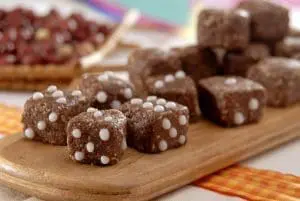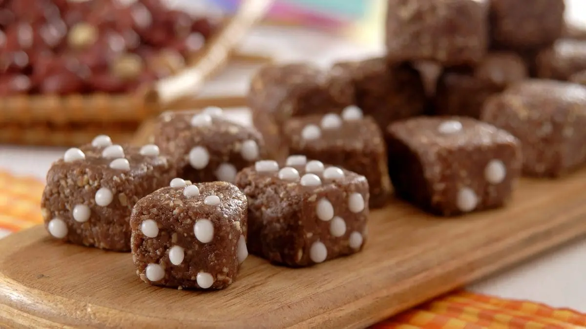 Bata todos os ingredientes no processador até ficar com consistência de farofa úmida. Coloque um pouco da farofa na mão e aperte, se ficar uma bolinha, está pronto. Molde os dadinhos e decore com confeito de chocolate meio amargo se quiser.