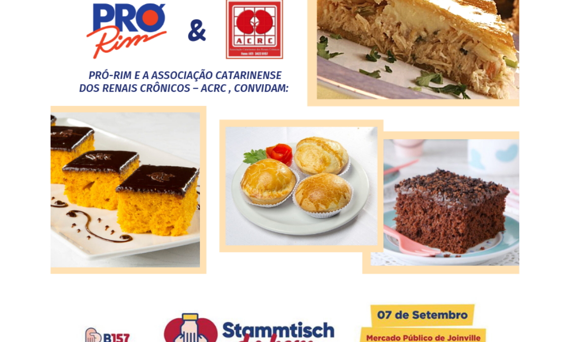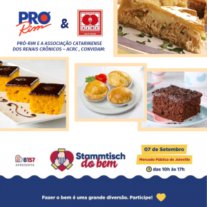 Neste sábado (07/09), a Fundação Pró-Rim e a Associação Catarinense dos Renais Crônicos – ACRC estarão participando do Stammtisch do Bem, no Mercado Público de Joinville (SC). O evento, organizado pelo grupo de amigos B157, vai reunir 30 entidades e grupos sociais para a venda de comidas, artesanatos e produtos sociais. O horário do evento é das 10h às 17h, aberto ao público.