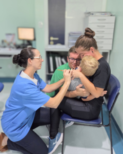 Amparado pelos pais, menino de 5 anos tem a medicação aplicada na Fundação Pró-Rim