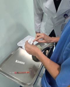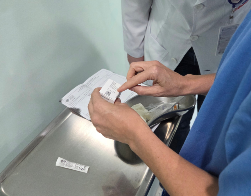 Enfermeira e farmacêutica conferem os dados de lote e validade do medicamento antes da aplicação